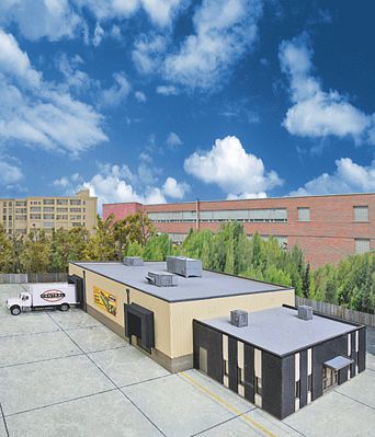 The Walthers Cornerstone HO Scale Central Beverage Distributors with Office Annex kit is based on contemporary rail-served warehouses. The warehouse features corrugated construction on a block foundation and the office annex is a brick structure with a canopied main entrance. The warehouse has molded cut lines inside for easy customizing to fit your space. Use this kit in your industrial park as a destination for boxcars or as part of a larger complex. Central Beverage Distributors is one of many Cornerstone HO Scale industry kits.