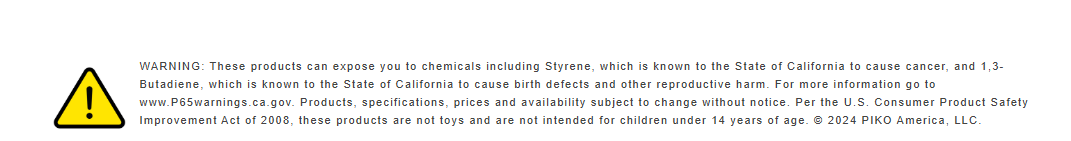 California Residents: Some products in our store can expose you to chemicals including Lead and Styrene, which are known to the State of California to cause cancer and birth defects, or other reproductive harm. For more information, go to:www.P65Warnings.ca.gov